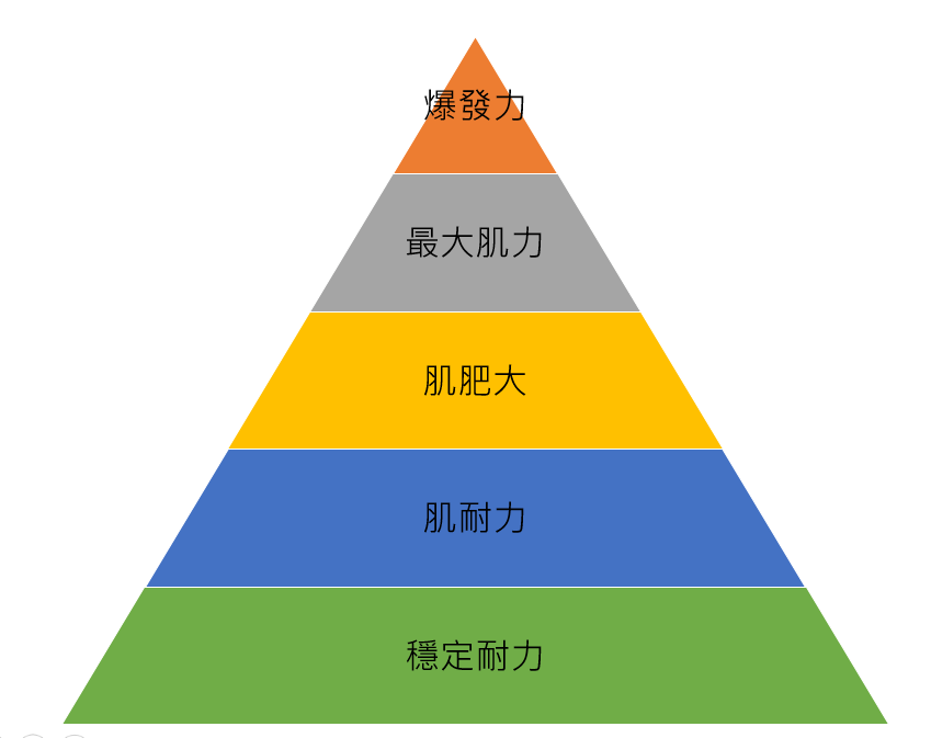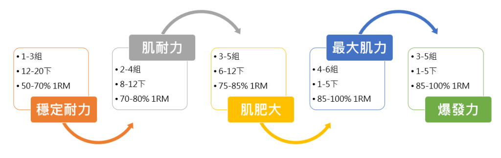 以下將肌力訓練的進程分成五個階段:穩定耐力、肌耐力、肌肥大、最大肌力、爆發力。